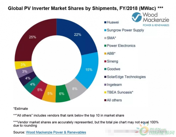 自2013年以來,五大光伏逆變器廠商每年度的市場份額不斷增加,但2018年出現(xiàn)了反轉(zhuǎn)。據(jù)Wood Mackenzie電力與可再生能源統(tǒng)計,2018年,全球前五大逆變器供應(yīng)商的市場份額總和下降,由原先的62%降至56%。 前五大廠商的市場份被排名6至10位的企業(yè)所瓜分,后五家企業(yè)的市場份額總和從15%增加至19%。 自2012年起開始追蹤逆變器市場份額,陽光電源和SMA每年都在全球光伏逆變器市場的領(lǐng)導(dǎo)者之列。華為在2018年連續(xù)第四年位居全球榜首。 因2018年5月中國光伏市場政策調(diào)整,華為的全球市場份額在2018年下降了4個百分點(diǎn),其它多數(shù)中國供應(yīng)商也受到不同程度的沖擊。 按2018年全年發(fā)貨(MWac)的全球光伏逆變器市場份額