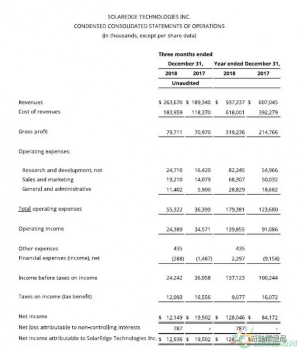 根據(jù)SolarEdge發(fā)布的消息,2018年全年?duì)I收9.372億美元,公認(rèn)會(huì)計(jì)準(zhǔn)則毛利率為34.1%,基于公認(rèn)會(huì)計(jì)準(zhǔn)則凈攤薄每股收益2.69美元。