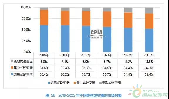 光伏逆變器按照適用場所分為集中式逆變器、集散式逆變器、組串式逆變器以及微型逆變器。集中式和組串式逆變器我相信大家都不很清楚其中的區別,今天我們主要講一講集散式光伏逆變器,集散式光伏發電解決方案是指:分散MPPT尋優,集中并網發電形式,通過前置多個MPPT控制優化器,實現多路MPPT尋優功能,匯流后采用集中式逆變器逆變的新型、高效光伏發電解決方案。 此方案的推出,讓電站投資商們在集中式和組串式之外,還有第三種選擇。目前,國內擁有集散式解決方案并投入項目的企業還不多,無錫上能和深圳禾望稱得上是此類技術的代表,上能力推的集散式光伏發電解決方案比集中式逆變方案發電收益更高,比組串式逆變方案成本更低,可使系統發電量提升2%~5%。作為傳統逆變器的重大創新,集散式方案在大同領跑者示范基地項目中獲得了同煤、中節能、華電、三峽新能源、正泰等業主的一致認可,得到了規模化應用。集散式方案直流傳輸電壓提高至800Vdc,交流輸出電壓提高至520Vac,交直流電纜成本大大降低;可實現2MW大容量子陣組網,進一步降低系統成本。 集散式逆變器,實現組串級MPPT,復雜山地電站發電量更高;提升直流和交流傳輸電壓,遠距離傳輸減少線損;容配比配置靈活,進一步降低系統成本;單機容量1MW,可根據地形靈活配置子陣容量;集中式并網,電網適應性更好,憑借發電量和系統成本優勢,將成為山地領跑者電站中的主流。 隨著分布式光伏市場的快速增大及集中式光伏電站中組串式逆變器占比的增高,組串式逆變器在 2018 年的市場占比達到了 60.4%。集散式光伏逆變器相比集中式逆變器提升 MPPT 控制效果,且相比組串式逆變解決方案擁有較低的建造成本。因此,市場份額呈現出逐年上升的趨勢。2018-2025 年不同類型逆變器的市場份額如下圖所示。