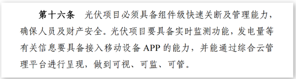 “項(xiàng)目建設(shè)管理”章節(jié)中的第16條明確要求:光伏項(xiàng)目必須具備組件級(jí)快速關(guān)斷及管理能力, 確保人員及財(cái)產(chǎn)安全。